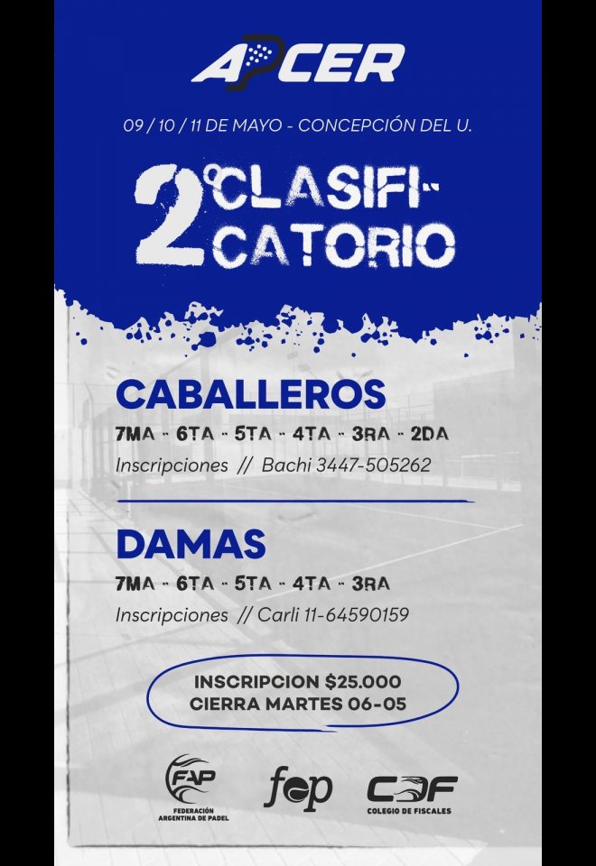 »» Evento: Clasificatorio Apcer CdelU Mayo 2025 »» Localidad: C. del Uruguay »» Fechas: 09/05/2025 al 11/05/2025